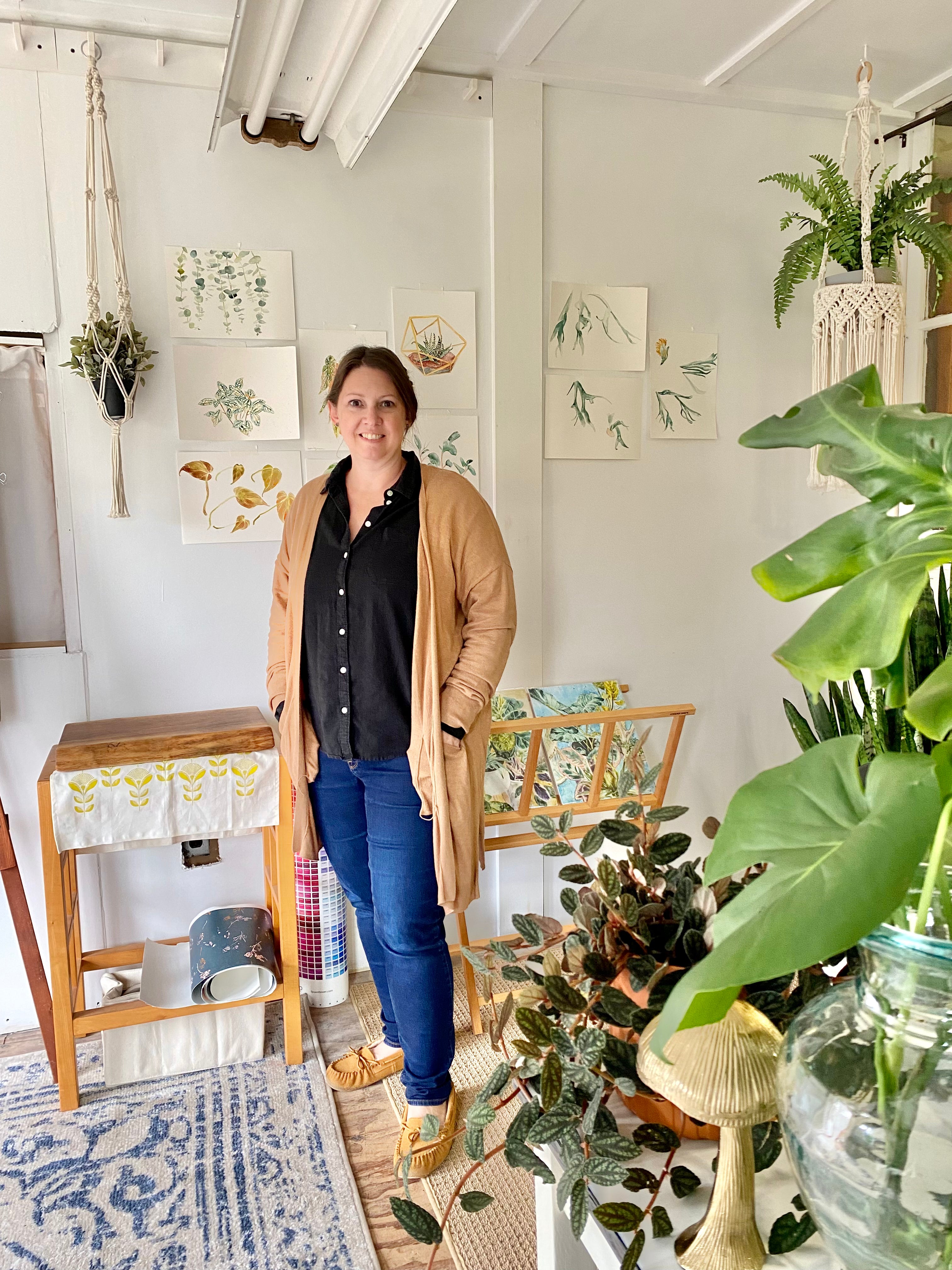 My studio is my favorite room in my home filled with beautiful books, well-loved art supplies, trailing plants, and usually two cats keeping me company. It’s a space where creativity feels easy and joyfully personal, where I can slow down and connect to what I love most: painting what inspires me and sharing it with others. There’s something meaningful about knowing my artwork might become a small part of someone’s everyday space adding color, comfort, and connection. It’s a privilege to do what I love and to see my designs find their place in homes that tell a story.